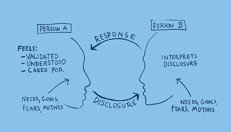 1. Person A shares something vulnerable with Person B about their feelings and story, this 'disclosure' is inspired by their unique motivations, needs, goals, and fears in that moment.